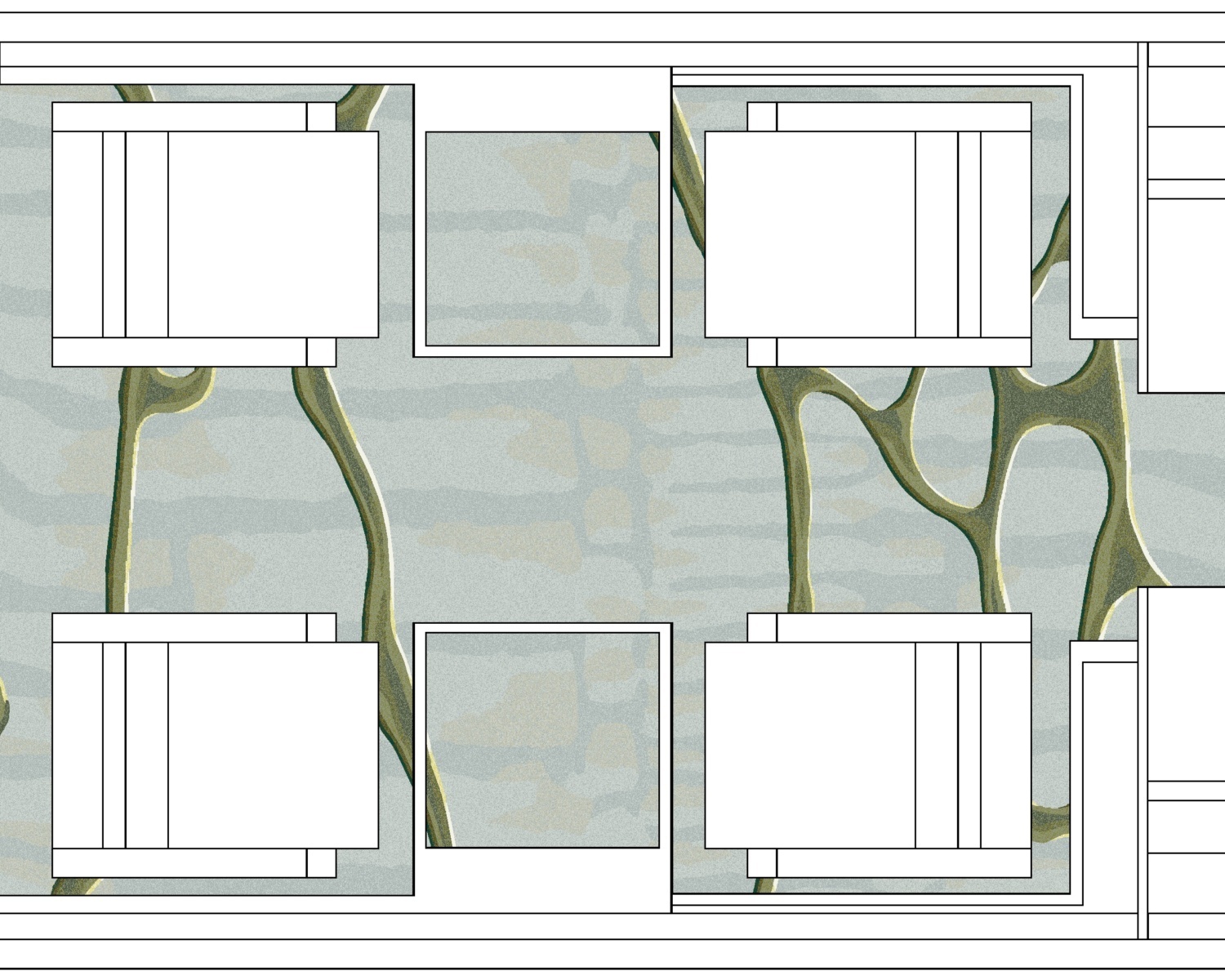 Large, algae coloured bubbles float on a surface of striated abstractions in this meditation inspired piece. Ribbon Gesture is influenced by the theme of koan “mu”.